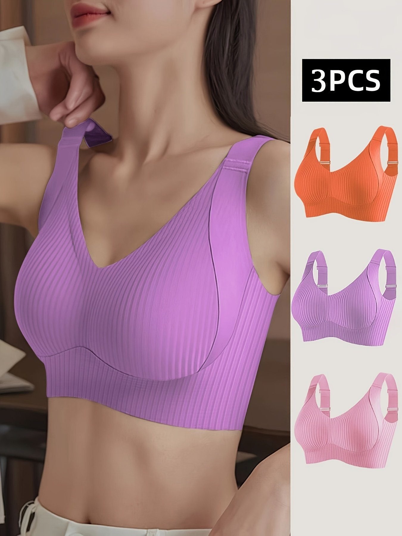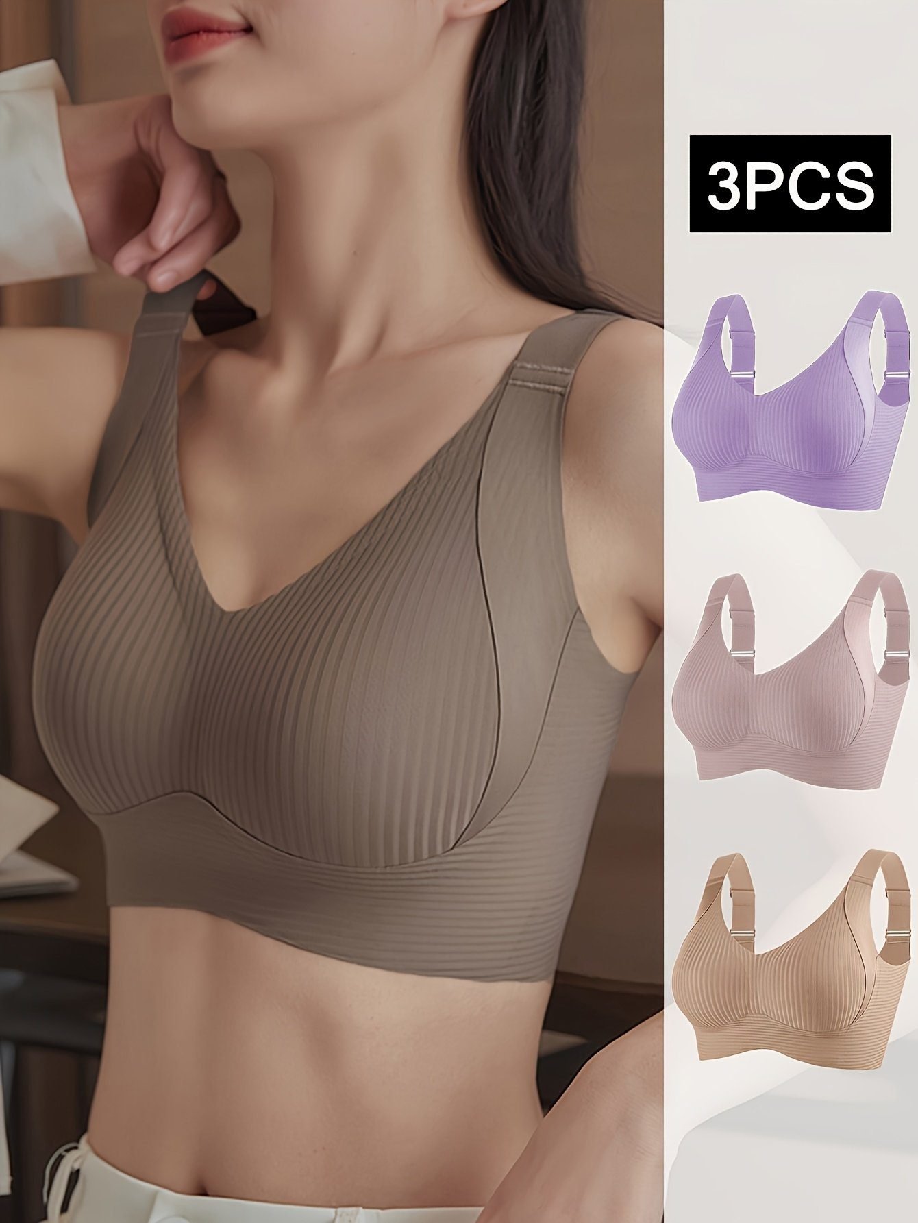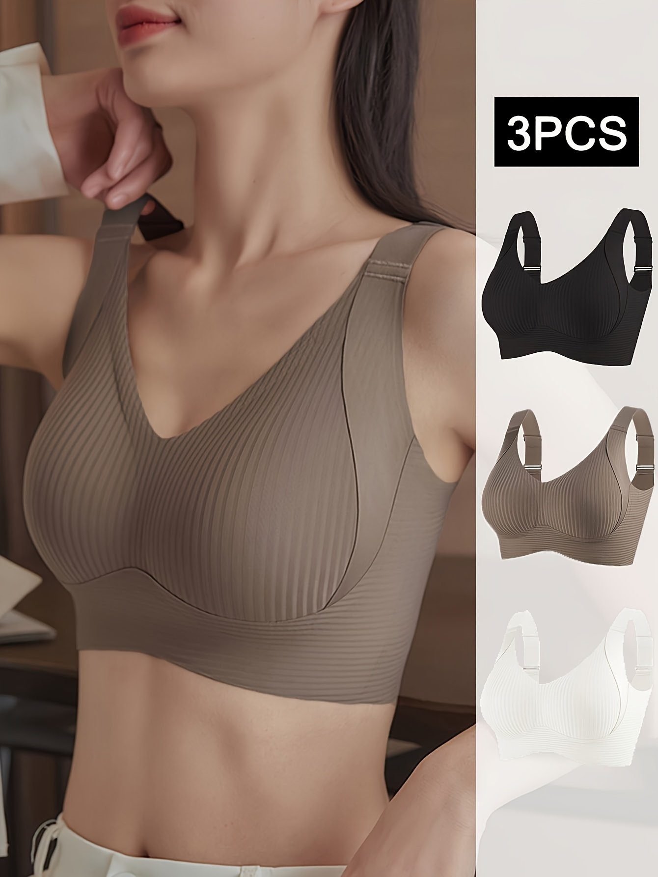 3pcs Women’s Push-Up Bras Anti-Sagging Adjustable Comfort Seamless High Support Wire-Free with Removable Pads& Side Smoothing Striped Design- Breathable Soft Fabric for Casual Attire Light Beigeu002FWhiteu002FBlack, Comfortable Lingerie