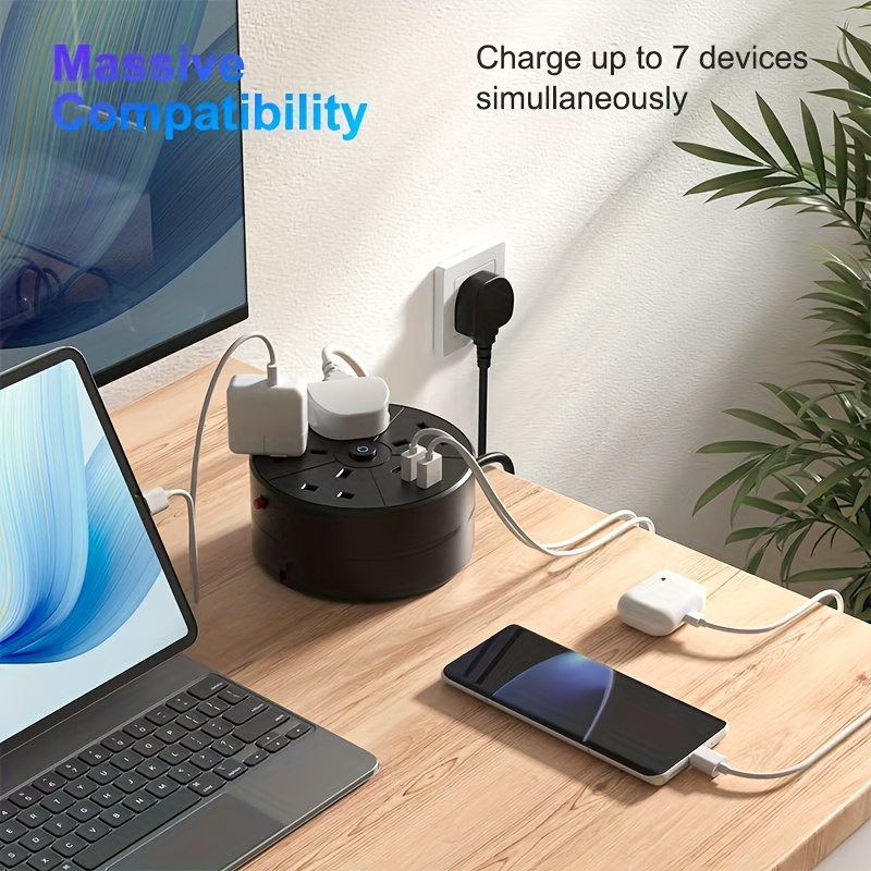 4-Outlet Power Strip with 2 USB-A & 1 Type-C Ports, Rotating Cable Management, Individual Onu002FOff Switches, Compact Flat Design for Home Office Bedroom Kitchen – UK Plug (220-240V), Power Strip with USB Ports, Workspace Organization, Spacesaving Solution, Sturdy Material, Remote Workers