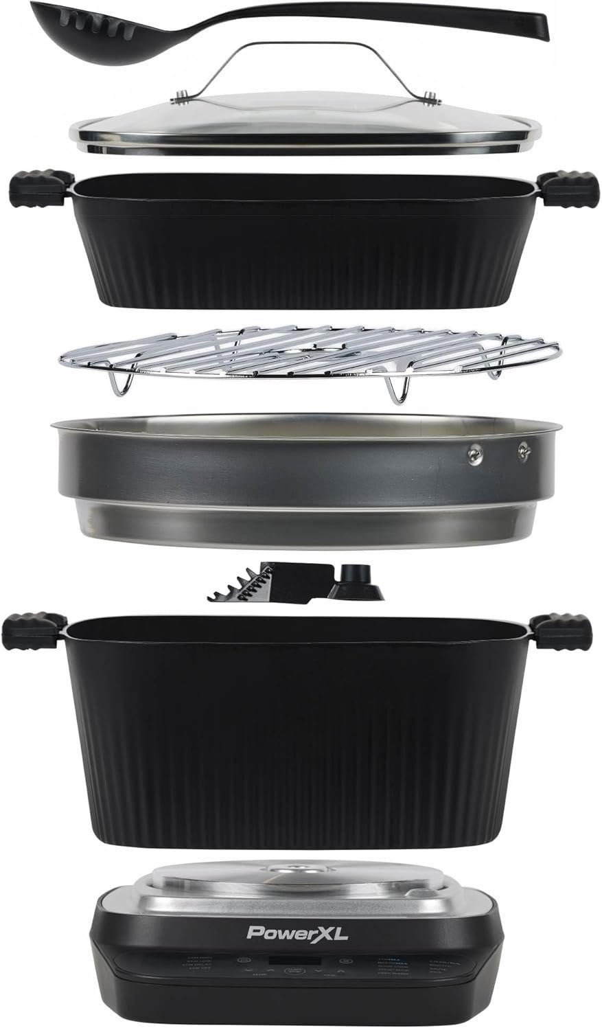 - 7.5QT FAMILY-SIZE CAPACITY & SKILLET ACCESSORY – Fits two whole chickens** or 6LBS of pork in one compact. space-saving design; skillet. wire rack. glass lid. ladle. non-stick cooking pot and paddle. steamer and rice basket. and recipe book included